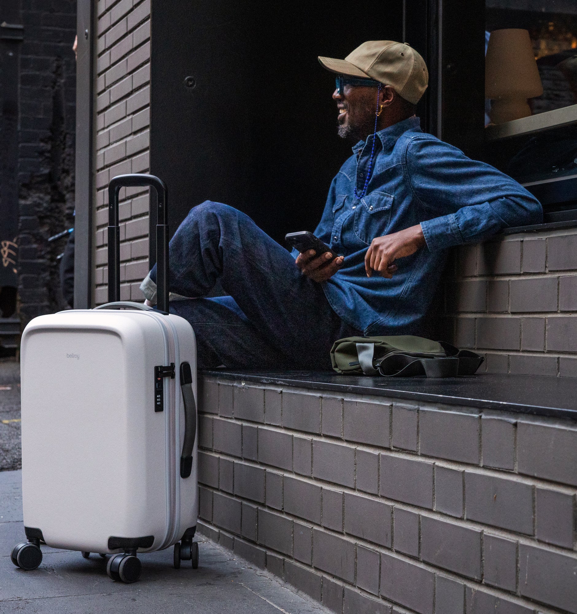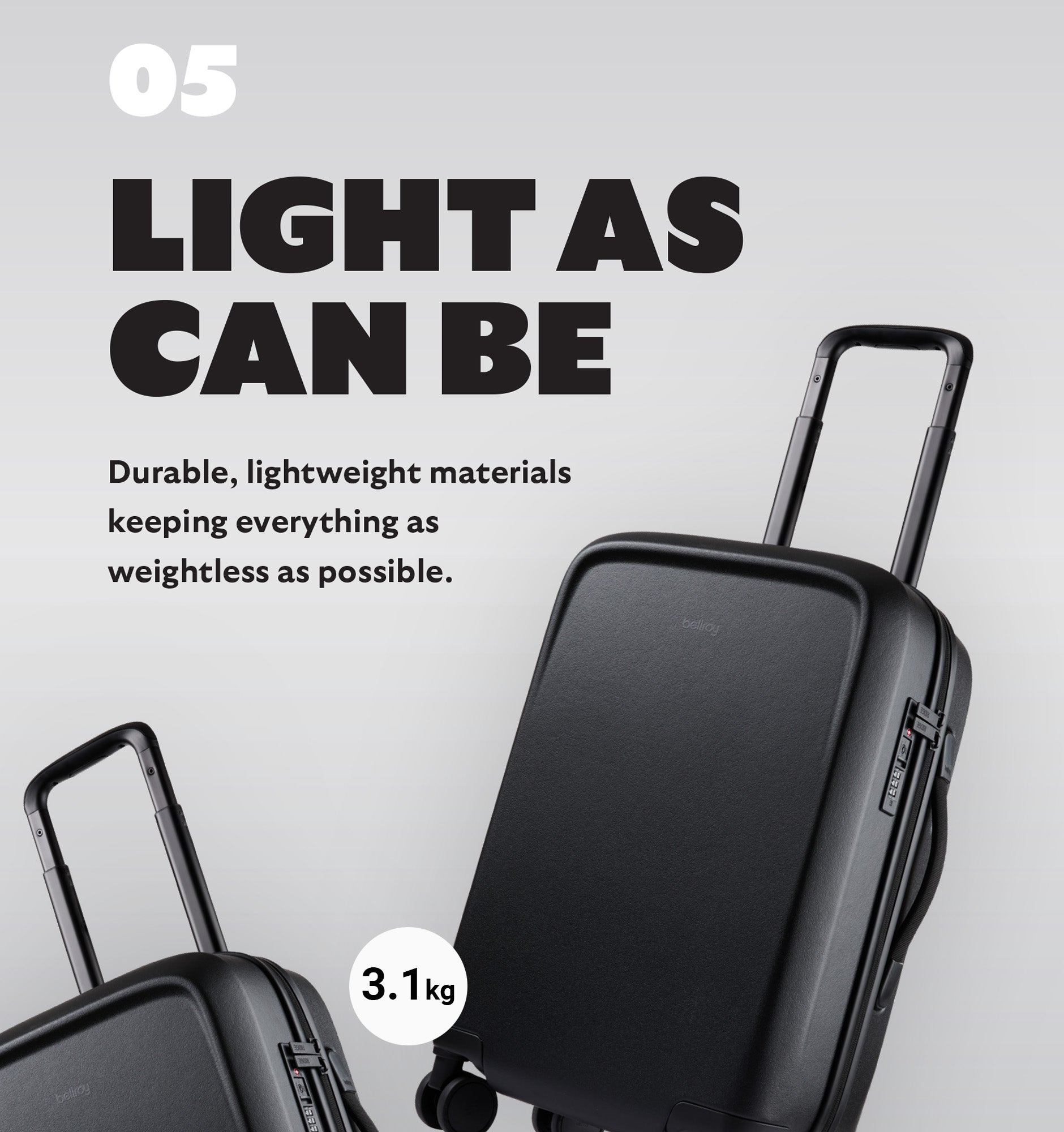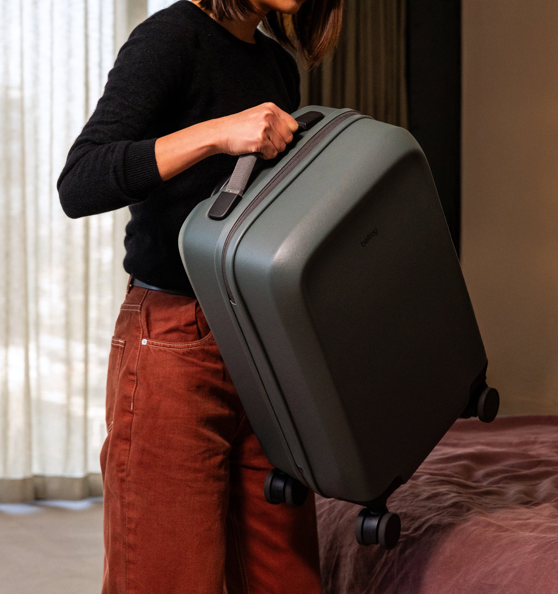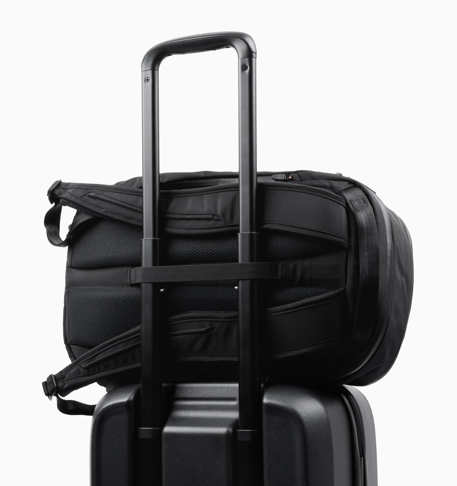 Rather than using an off-the-shelf solution, Bellroy developed a custom handle with a smooth profile, ergonomic underside button, and three lockable height settings for a comfortable grip and tailored fit.