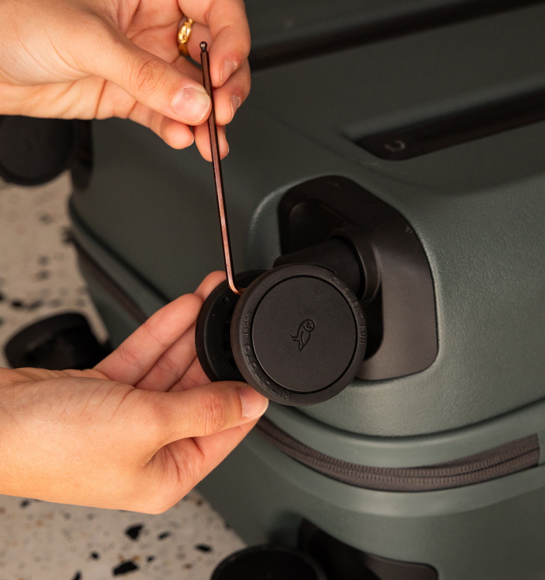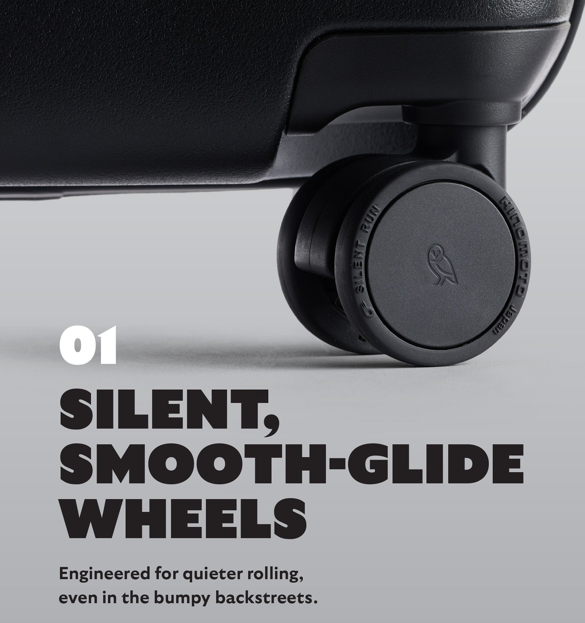 Glide through the airport on 4 HINOMOTO Lisof® Silent Run wheels – ultra smooth and soundless, thanks to the rubber compound. Plus, the polymer in the wheels is a bit bouncier than usual, adding impact resistance.