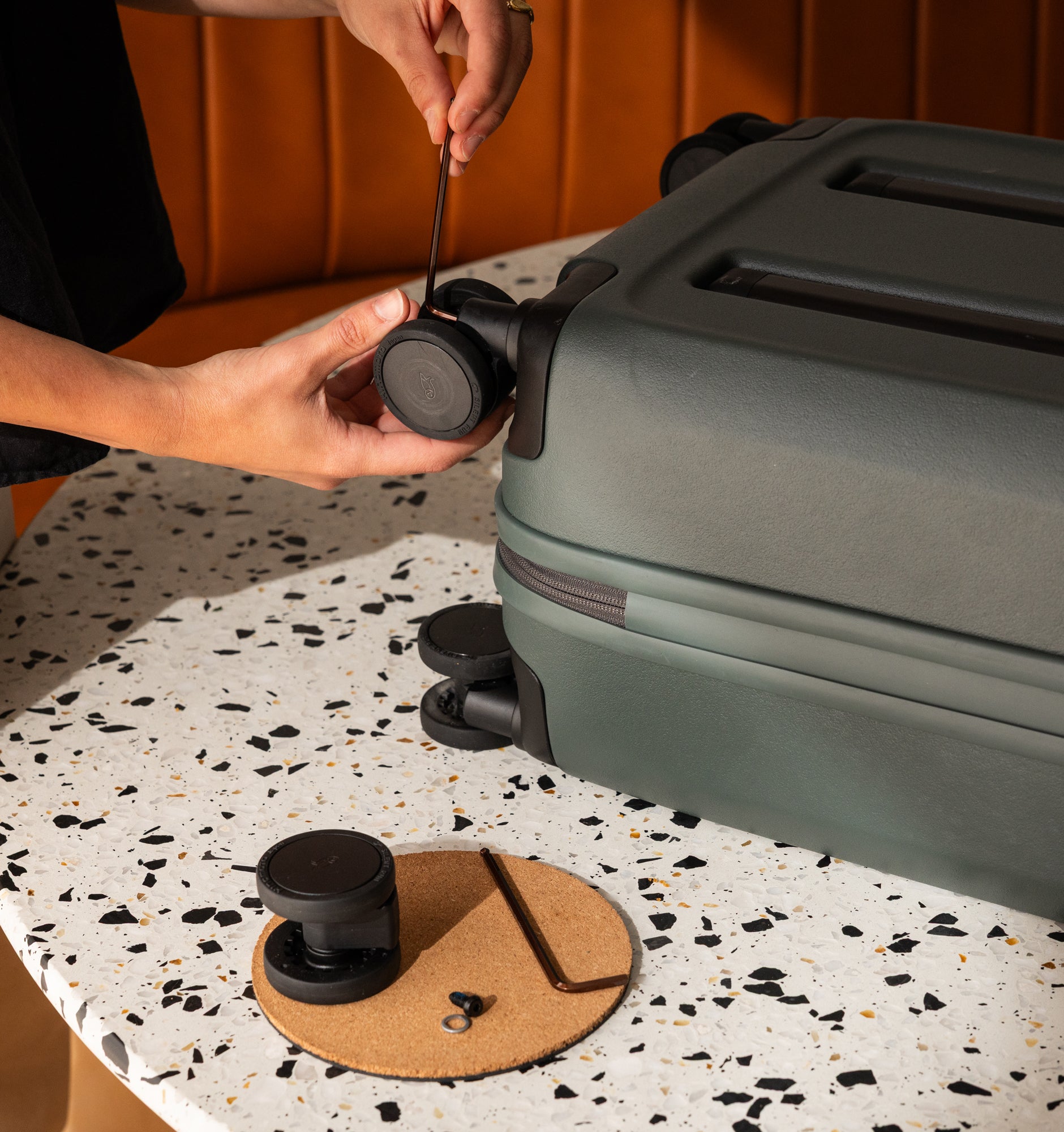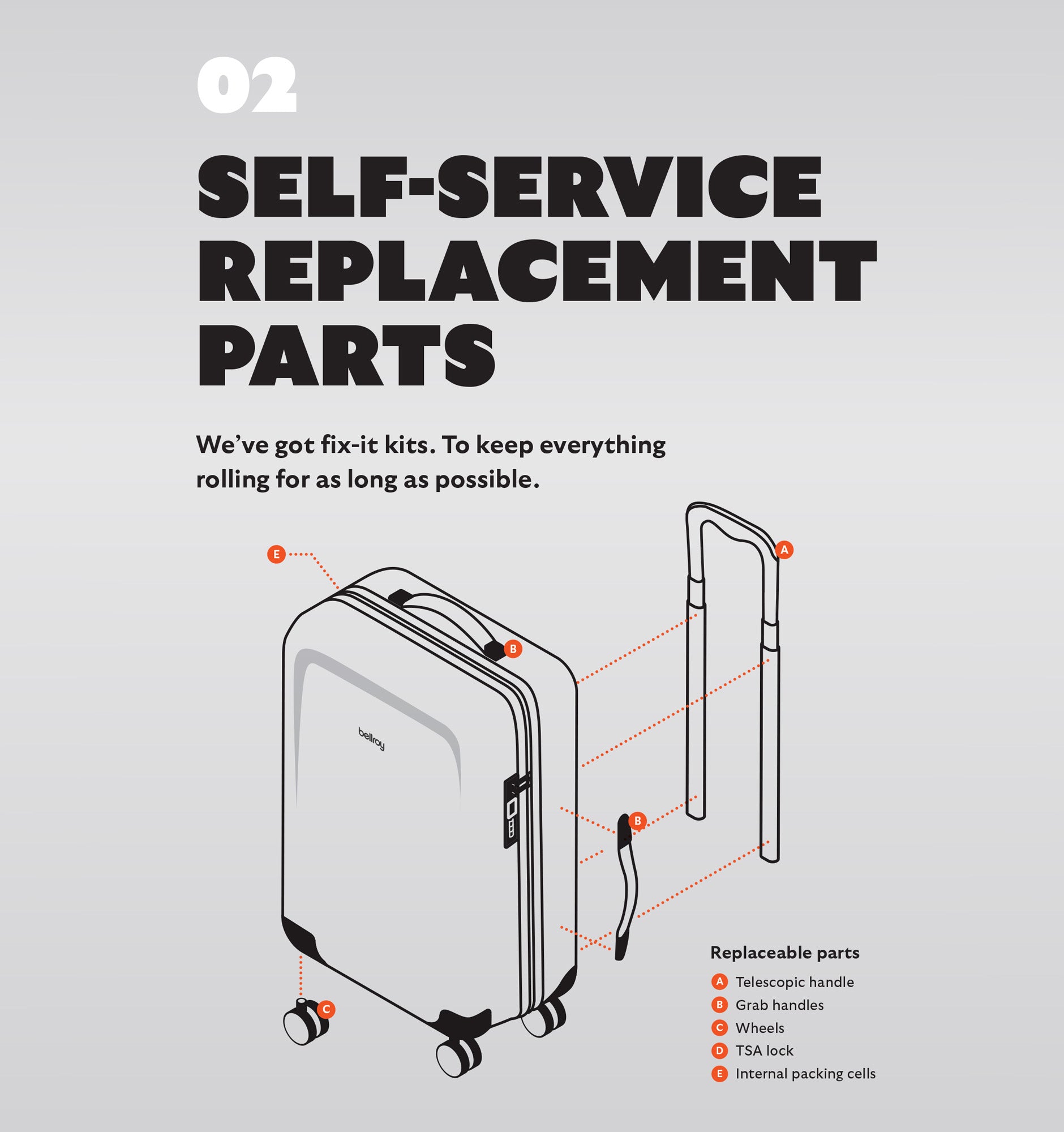 - Replaceable parts: Telescopic handle, grab handles, TSA lock, wheels, removable packing cells