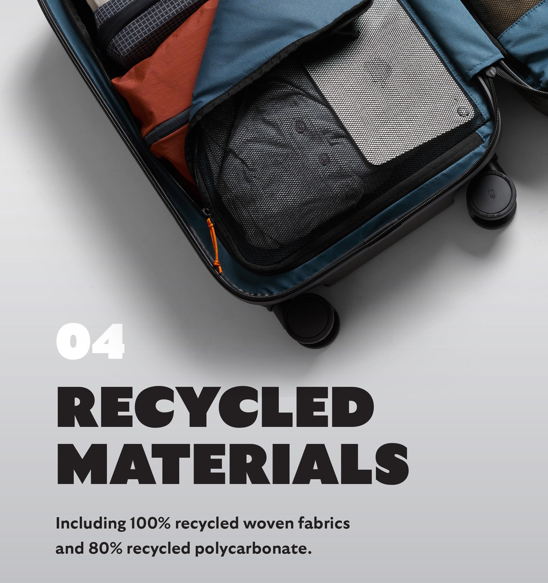 - Matte polycarbonate shell (80% post-consumer recycled) with recycled polyester ripstop lining