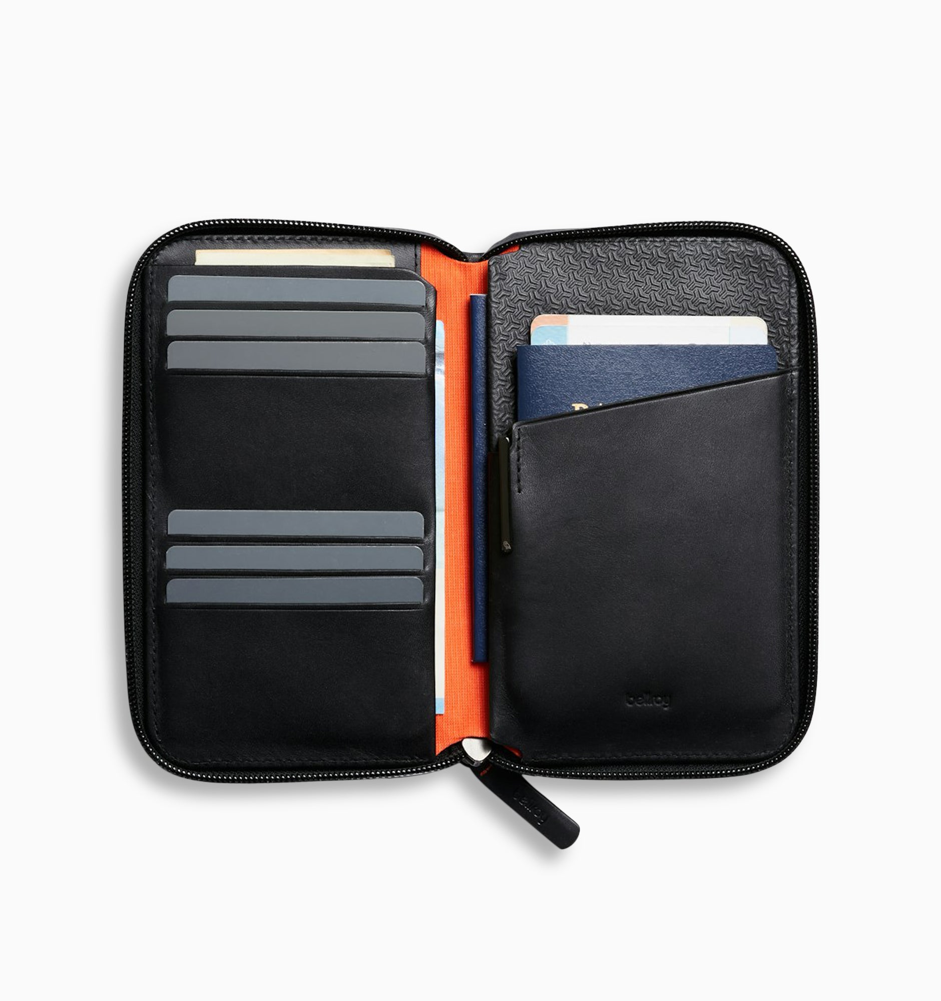 - Left, right and out of sight - Credit cards go left, passport goes right. Then extras – flat bills, receipts, a second passport – tuck behind, to keep things simple.
