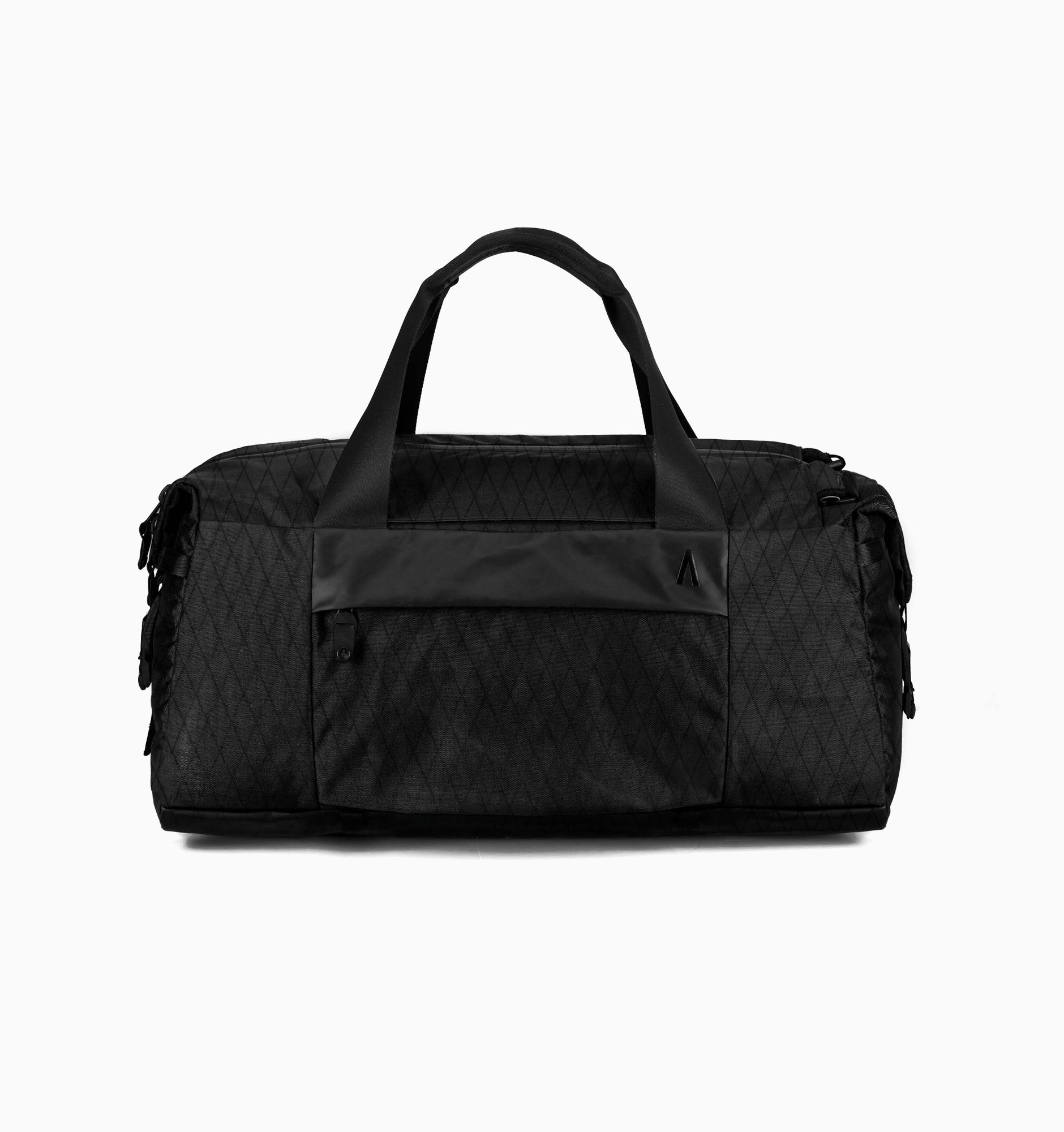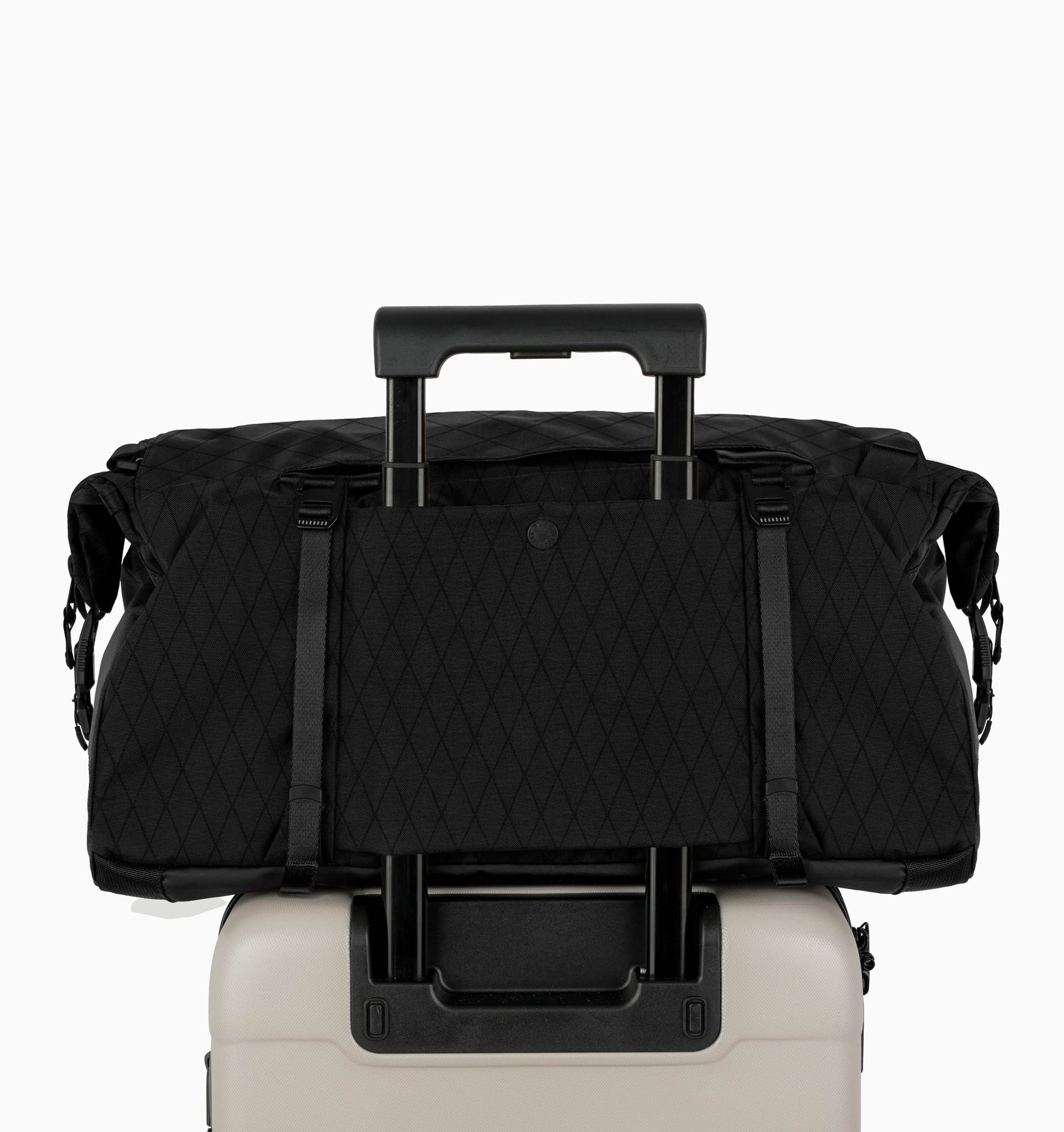 - Magnetic auto-locking buckles and nylon webbing compress the duffel.