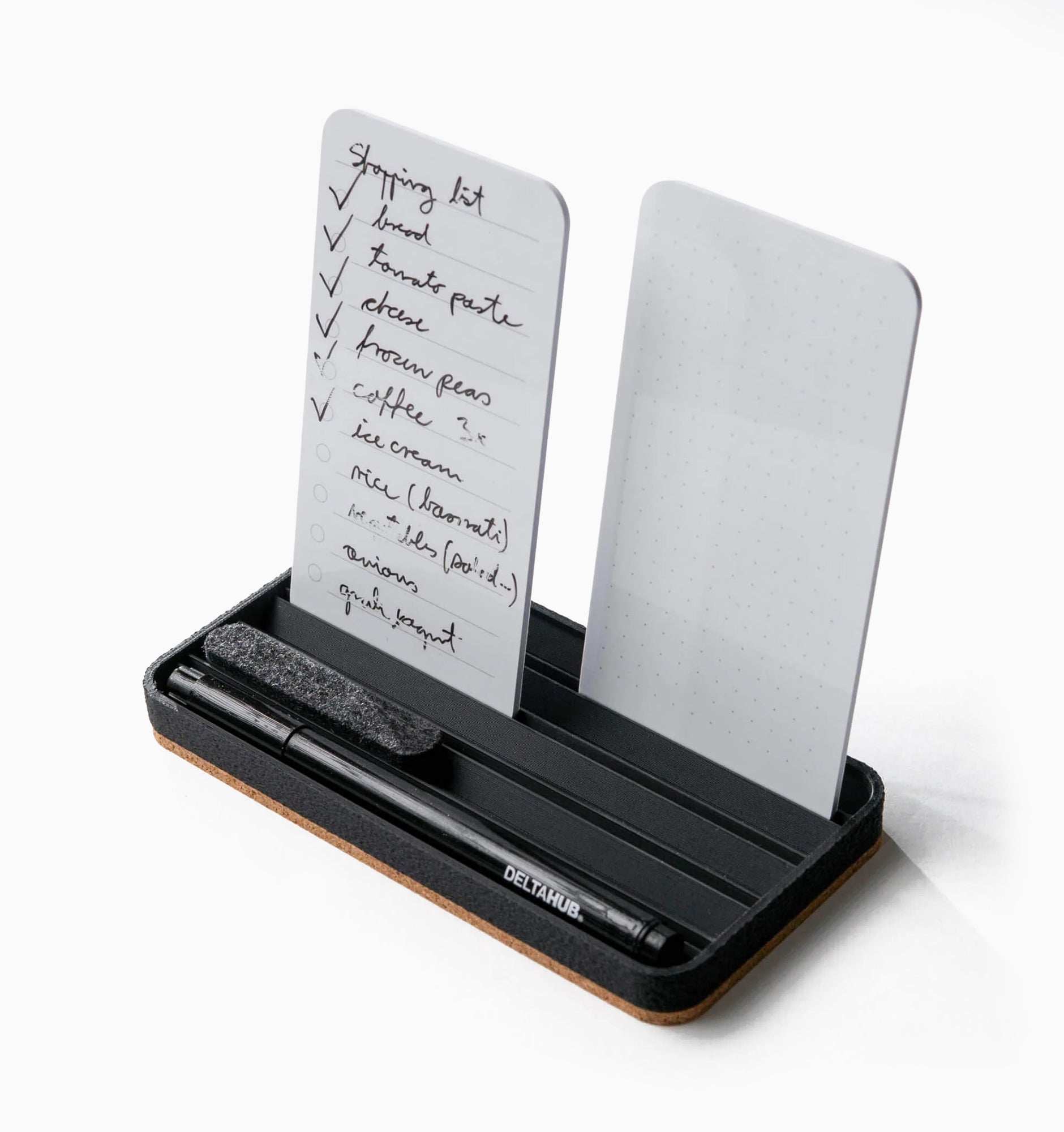 - Complete set included - In the box you’ll find the To-Do List base, two reusable PVC cards (one with a to-do template, one with a dotted grid, both blank on the back), a 0.4 mm dry-erase black marker, and a soft felt eraser.