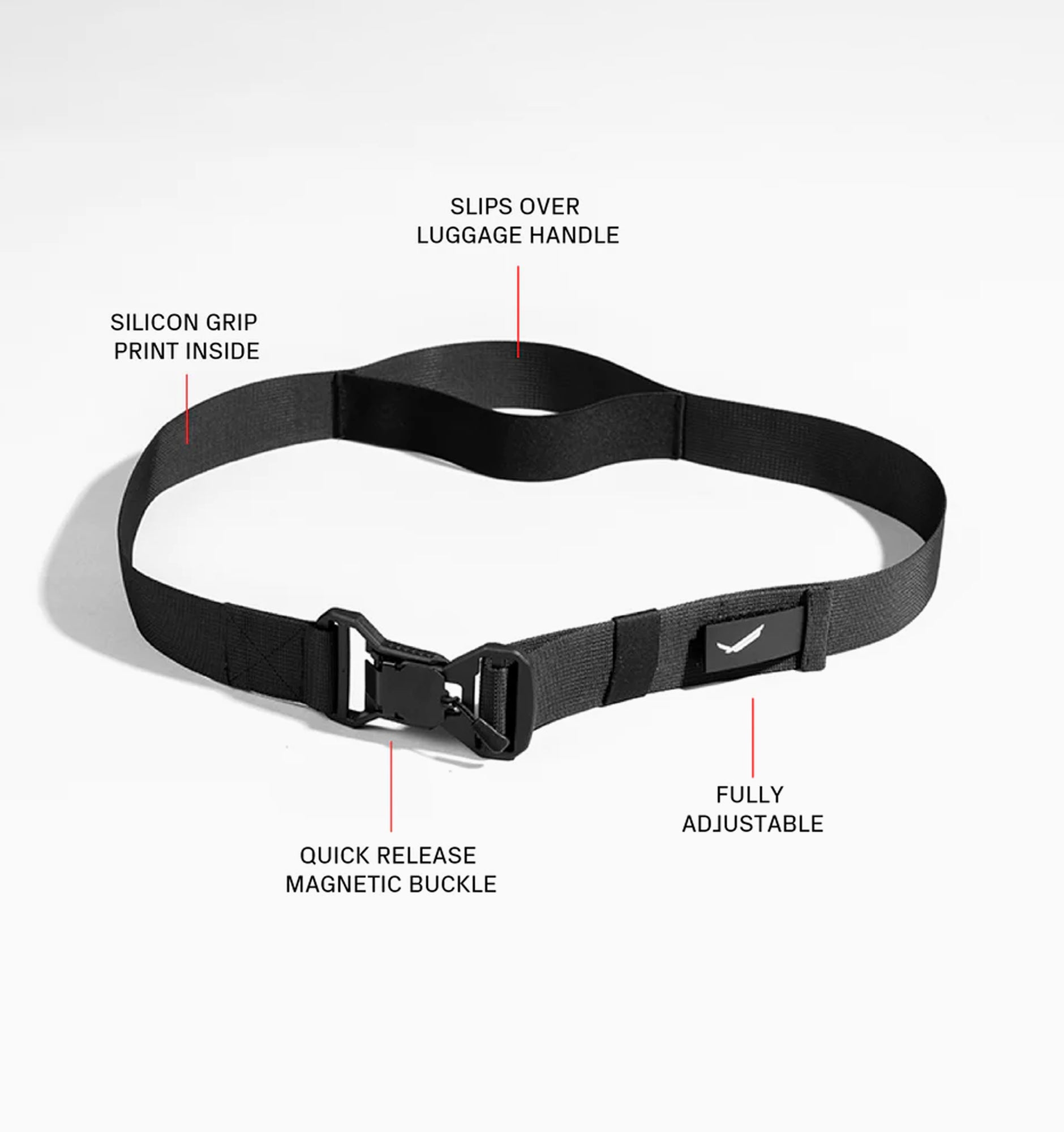 With a special sleeve designed to fit seamlessly over the handle of a suitcase, a silicone grip backing, and a sturdy, quick-release magnetic buckle, the lightweight Flyypod® Standby Belt is a must-have travel accessory. Securing personal items to wheeled luggage with the Standby Belt ensures they won't fall off or incur damage while in transit resulting in peace of mind and convenience on the fly.