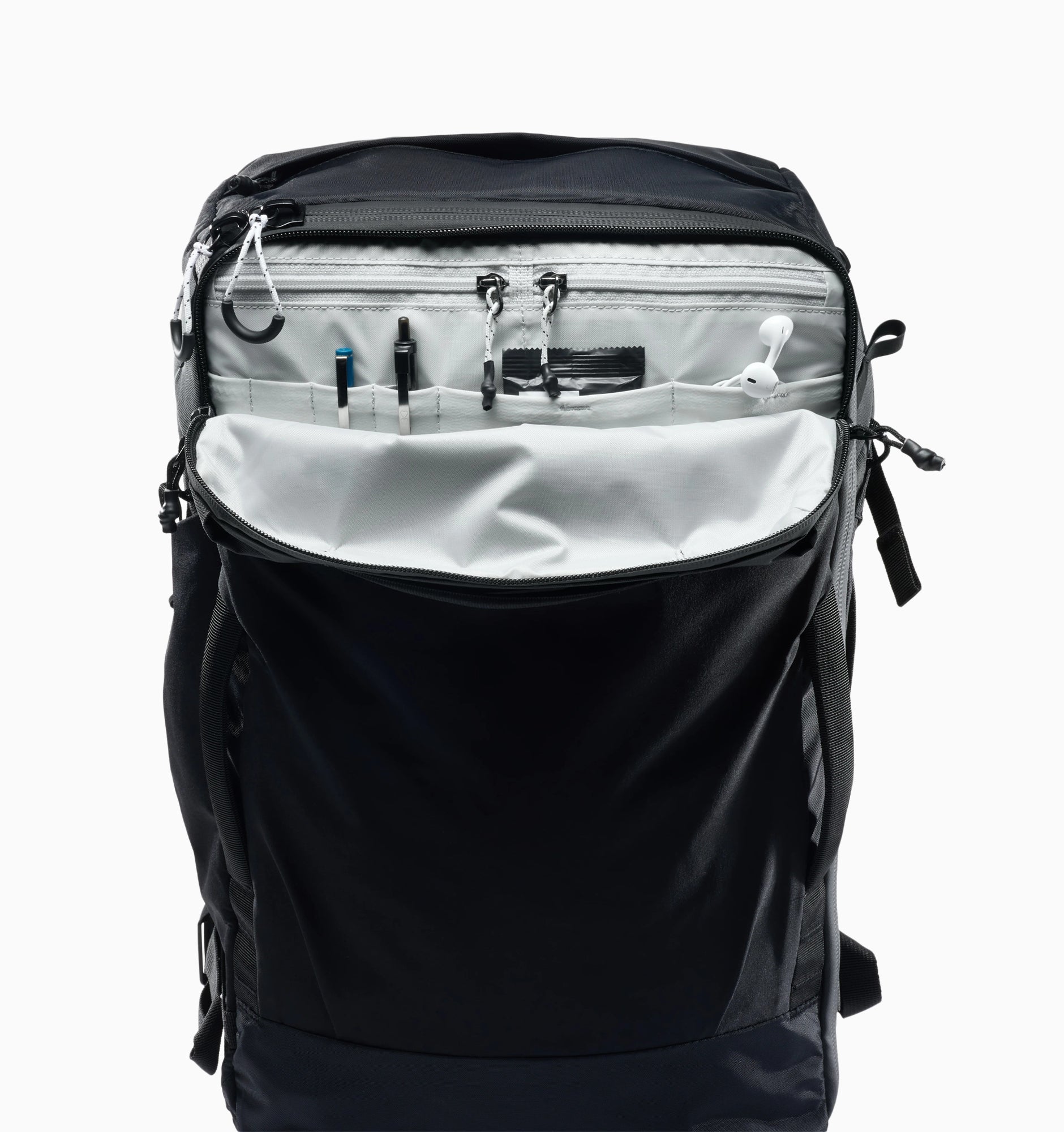- Two main compartment entry points: clamshell access and top-loading access