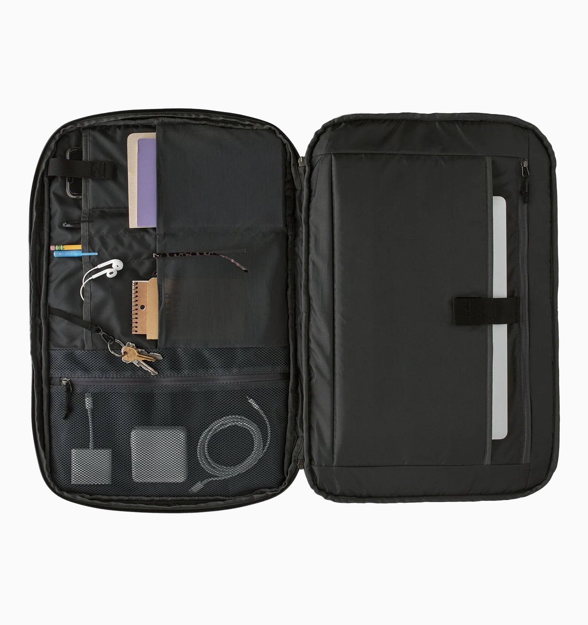 - Dedicated space for tech storage that fits most 15" laptops, with room for documents and cords; laptop carrier zips open and lies flat