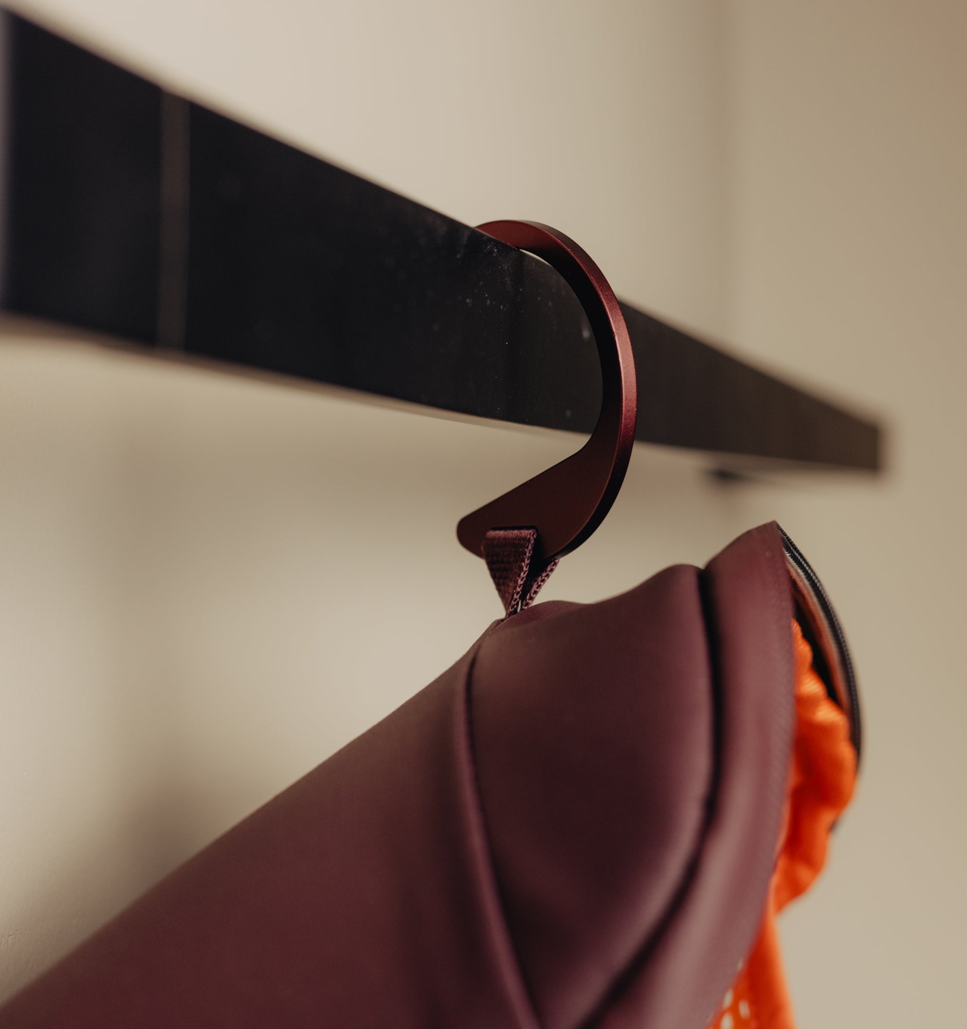 - Stowable aluminium hanger for easy deploying on any bar, towel rack or doorknob