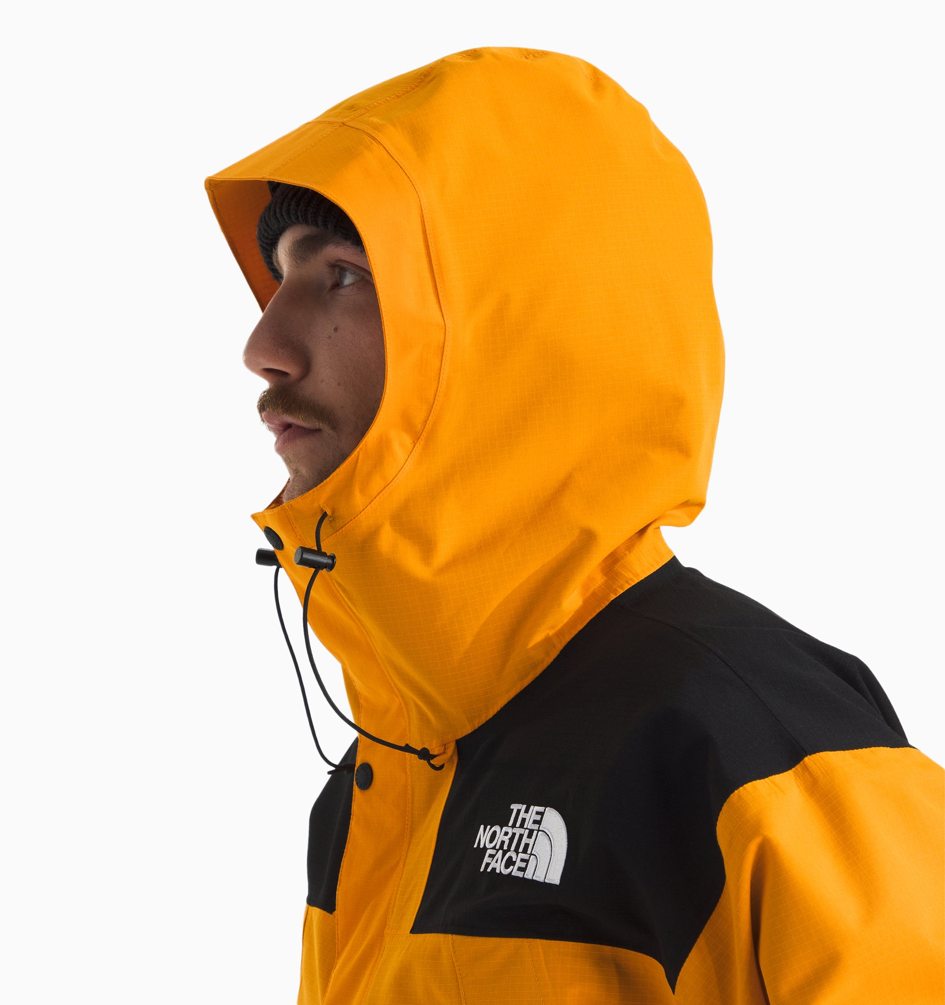 - Attached, adjustable, three-piece hood with a bonded brim and drawcord with cord locks